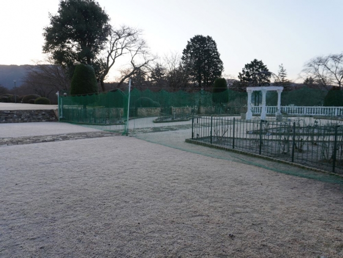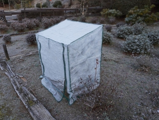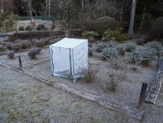今日も朝から冷え込みが強く各所で霜がみられます。昨日バラに施す「牛糞堆肥」が大量に届きましたので本日は、こちらを株元に施して一連のバラの冬作業はひと段落となります。以前紹介した肥料の施し方で今年はどれだけ綺麗に咲いてくれるか楽しみです。そして、慶良間つつじの養生もさらにバージョンアップしたところ中が見えないほど透明のシートに霜がついていました。こちらも無事咲いてくれることを願います。